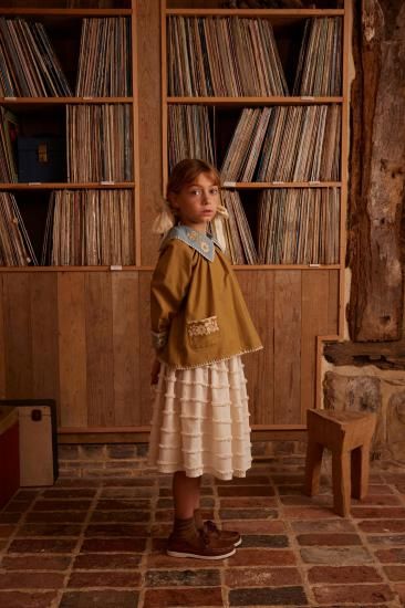 オペラカラー風の襟元、パッチポケット、袖口には美しいコントラスト刺繍が施され、Apolinaの特徴的なハンドクロシェステッチで丁寧に仕上げられています◇