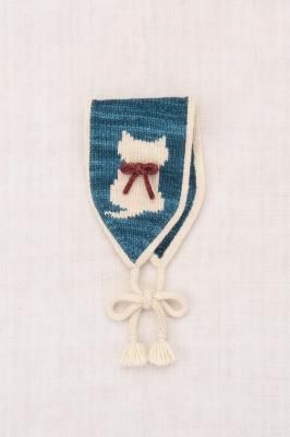 インターシャ技法で施された子猫のモチーフに、手編みのリボンとタッセル付きタイ留めがポイント◇