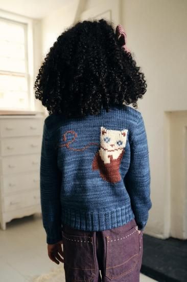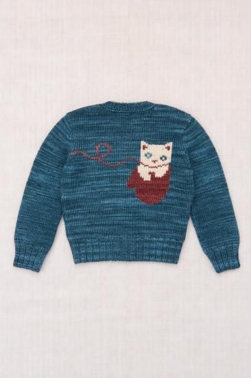 レトロキュートな子猫をモチーフにしたインターシャ模様、手編みのポップコーンステッチのディテール、リブ編みの縁取り、コロゾボタン留めと、デザイナーこだわりのディテールが散りばめられたスペシャルなカーディガン◇