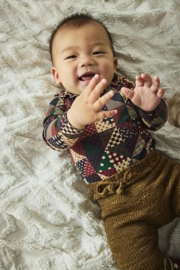 メリノウール素材に、手作業で施されたポップコーンステッチのディテール、ジグザグ模様、フィット感を高めるポップコーンタイ付きリブ編みのウエストバンド、リブ編みの裾が特徴です◇